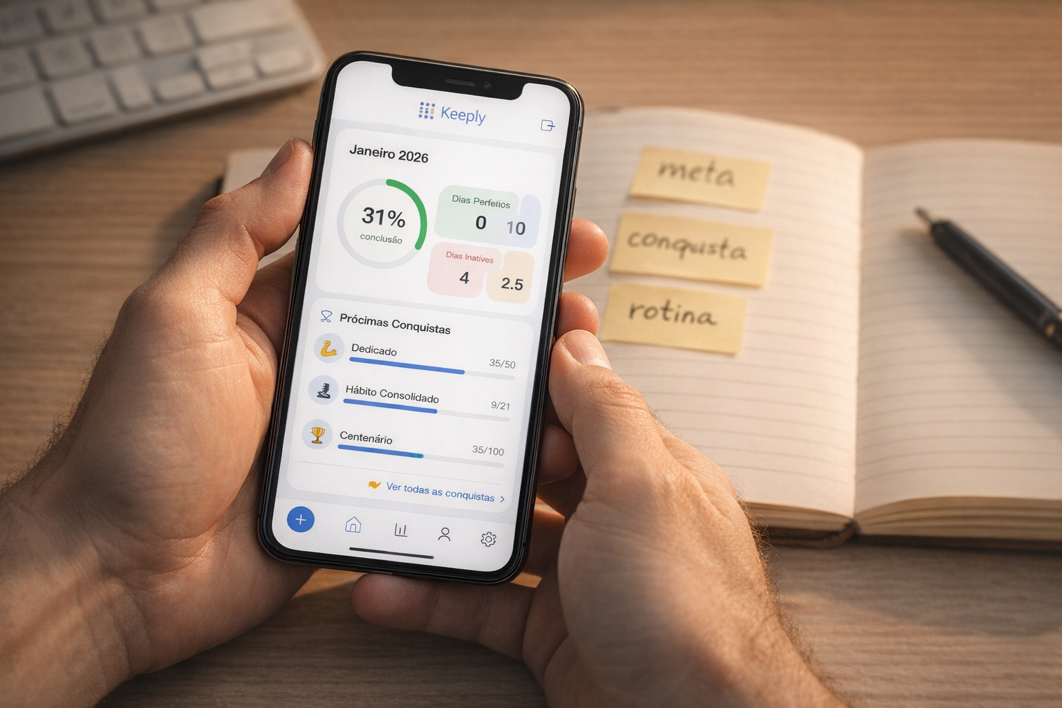 No Keeply, notamos que rotinas automáticas são capazes de aliviar a sensação de cobrança. Afinal, a ideia é tornar o hábito leve e quase natural.